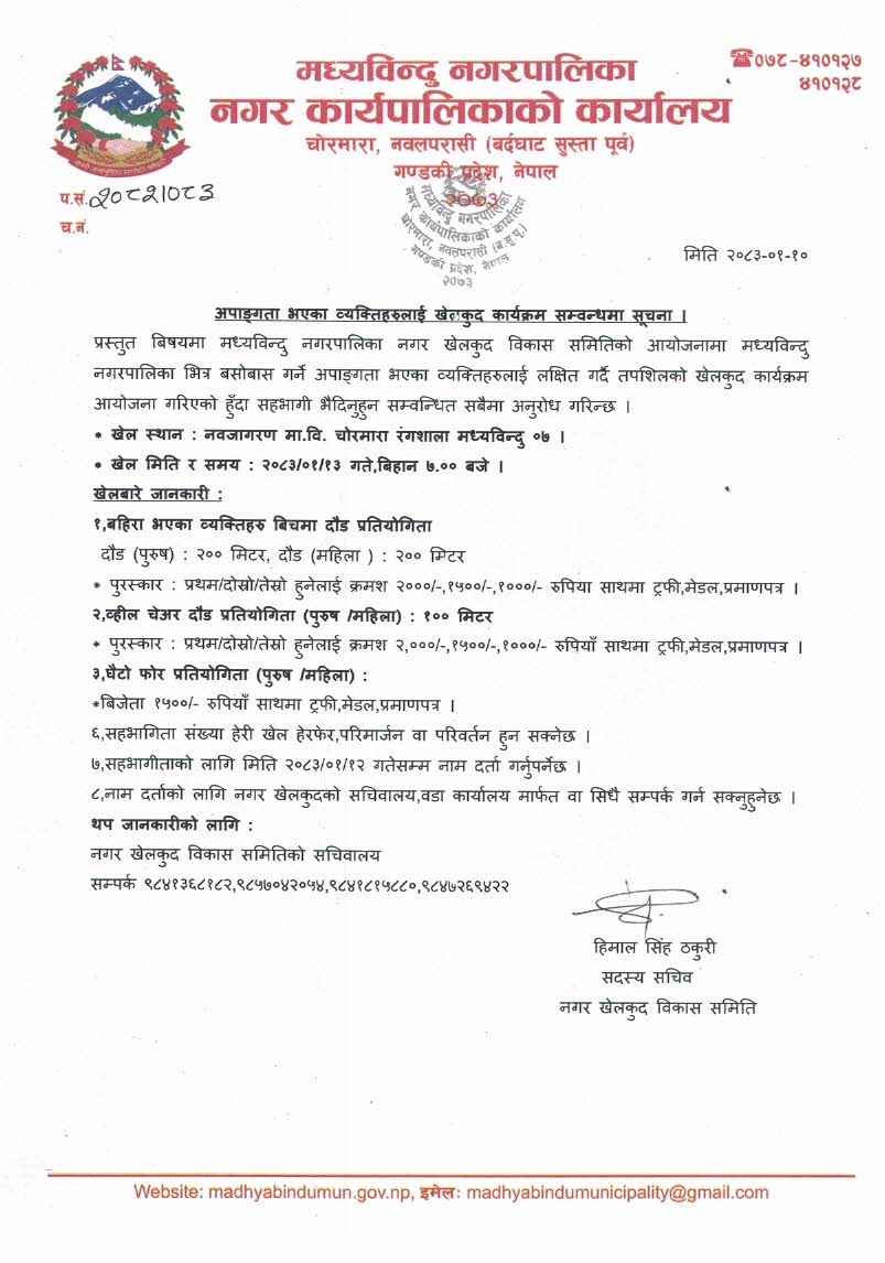 अपाङ्गता भएका व्यक्तिहरुलाई खेलकुद कार्यक्रम सम्वन्धमा सूचना ।