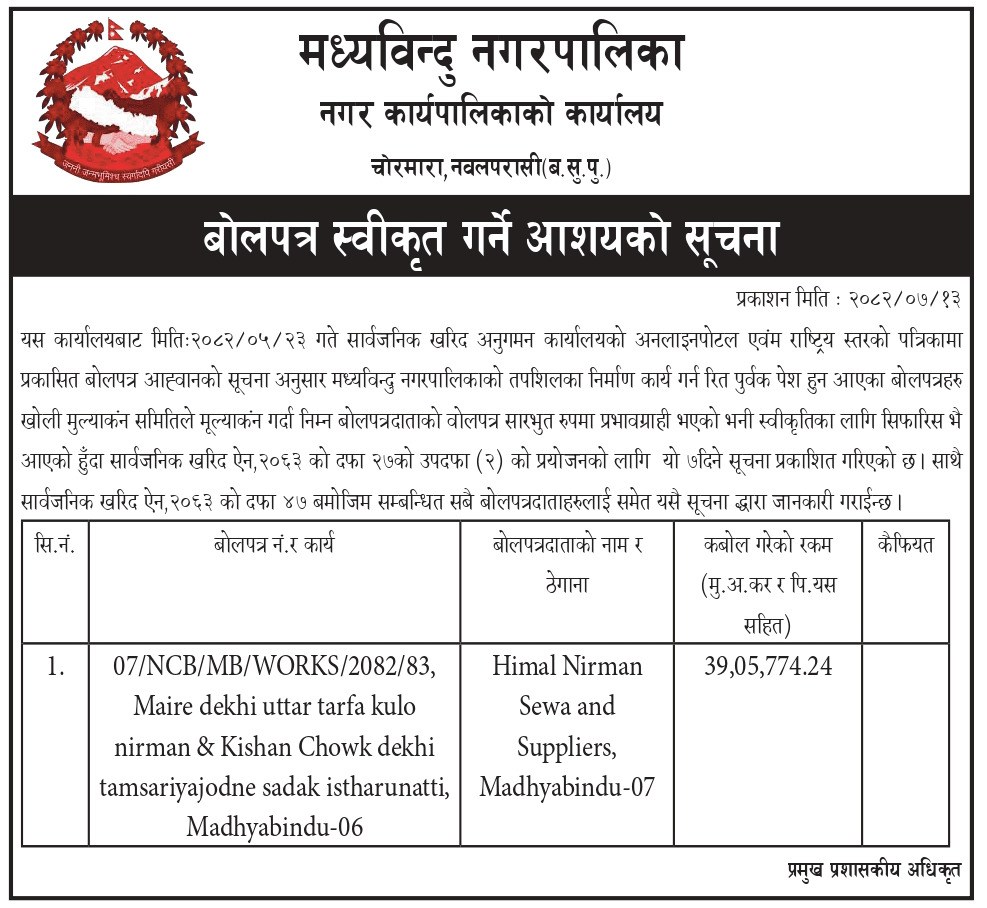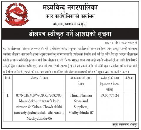 » बोलपत्र स्वीकृत गर्ने आशयको सूचना ।