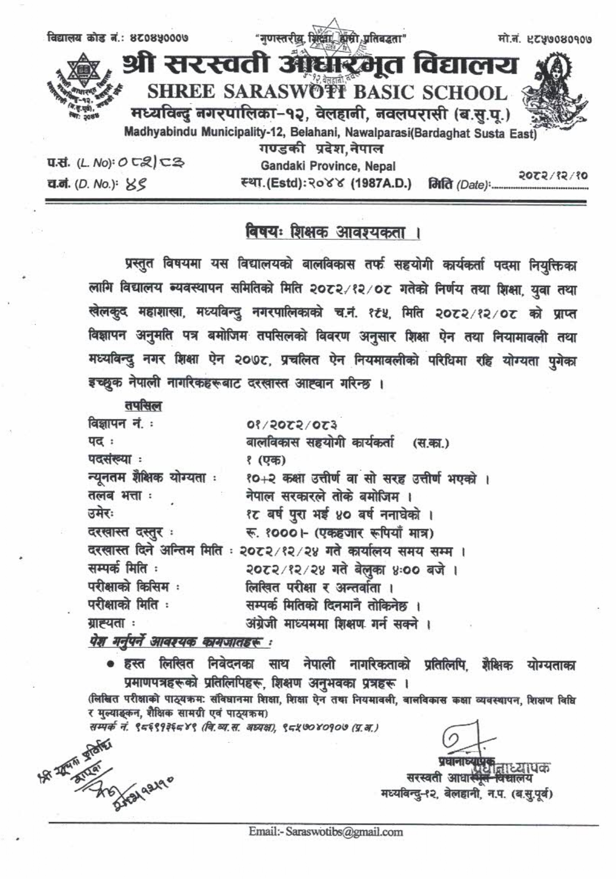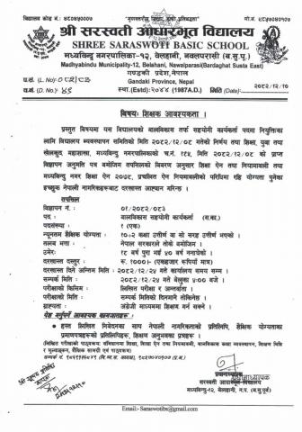 शिक्षक आवश्यकता ।