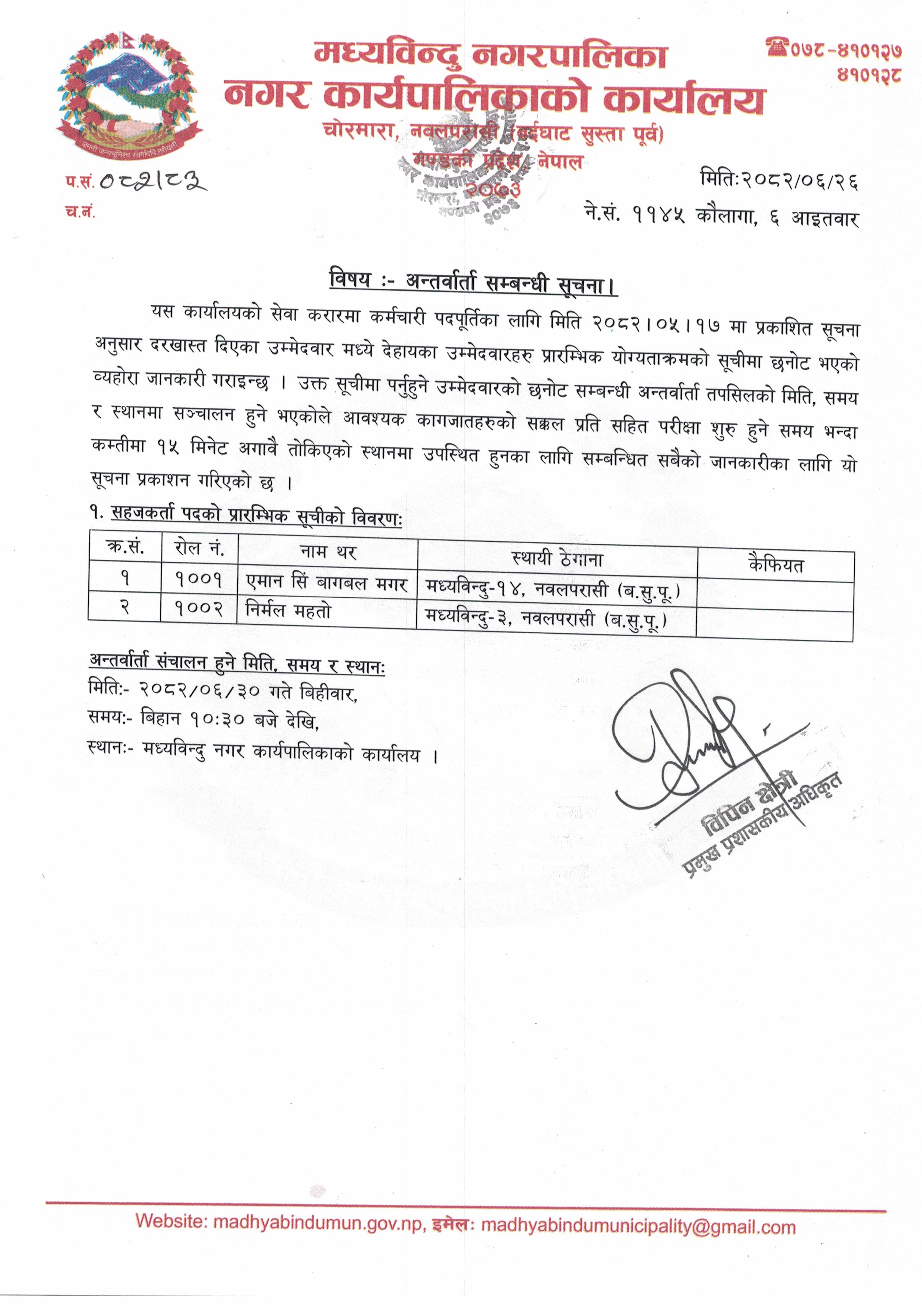 अन्तर्वार्ता सम्बन्धी सूचना ।