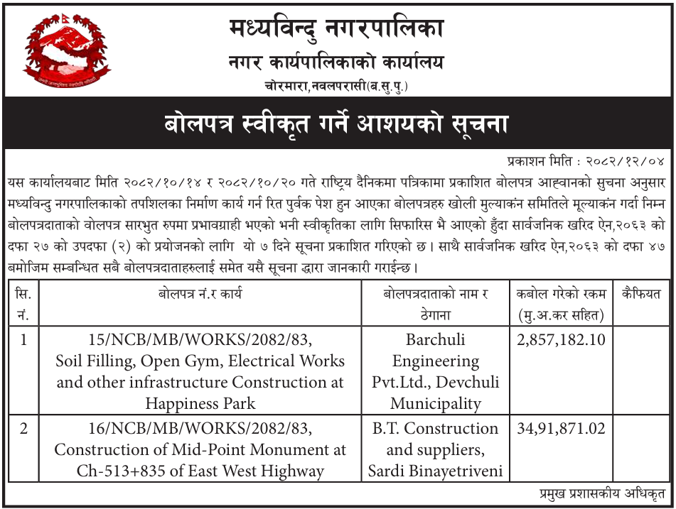 » बोलपत्र स्वीकृत गर्ने आशयको सूचना