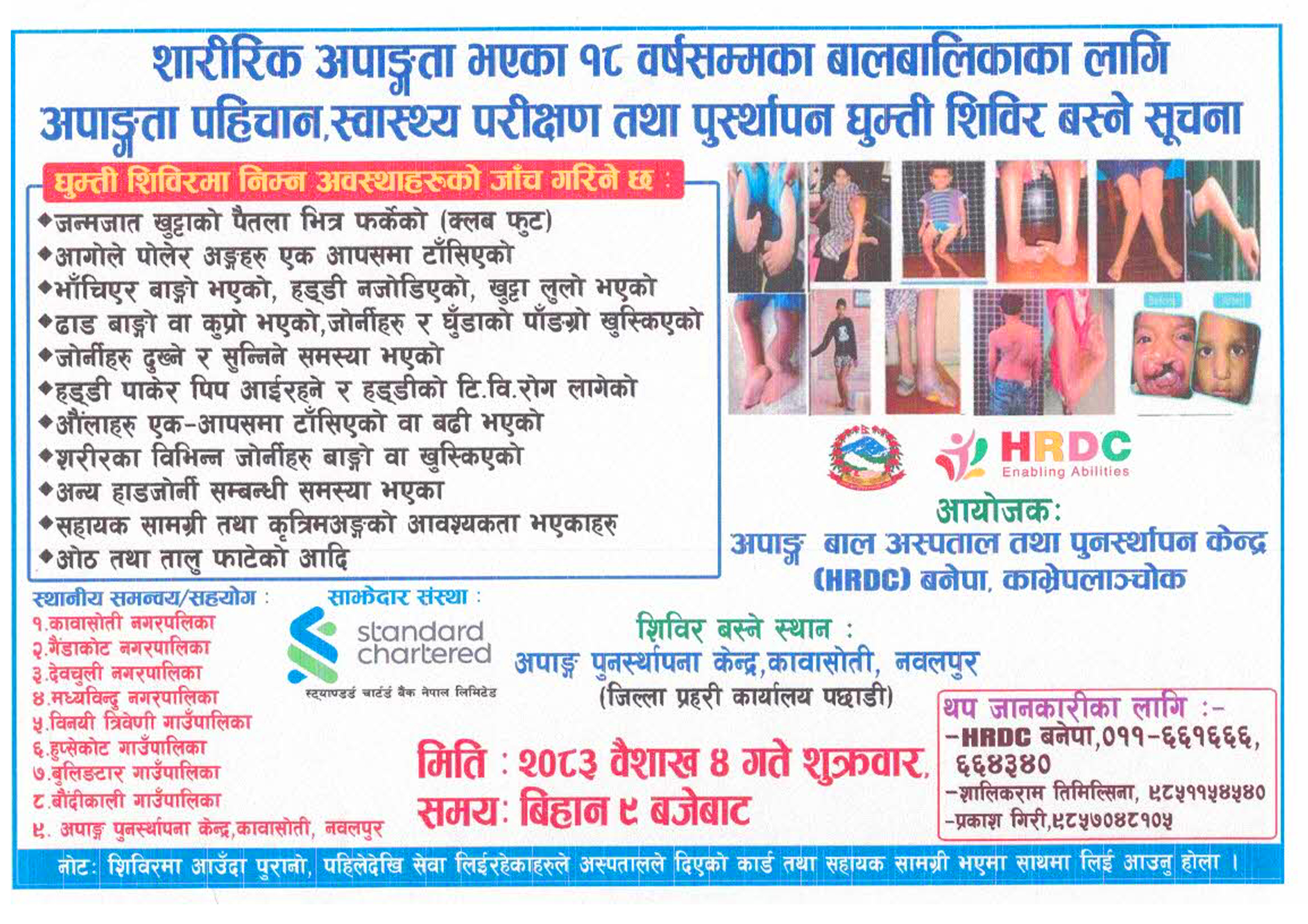 शारीरिक अपाङ्गता भएका १८ वर्षसम्मका बालबालिकाका लागि अपाङ्गता पहिचान, स्वास्थ्य परीक्षण तथा पुर्स्थापन घुम्ती शिविर बस्ने सूचना