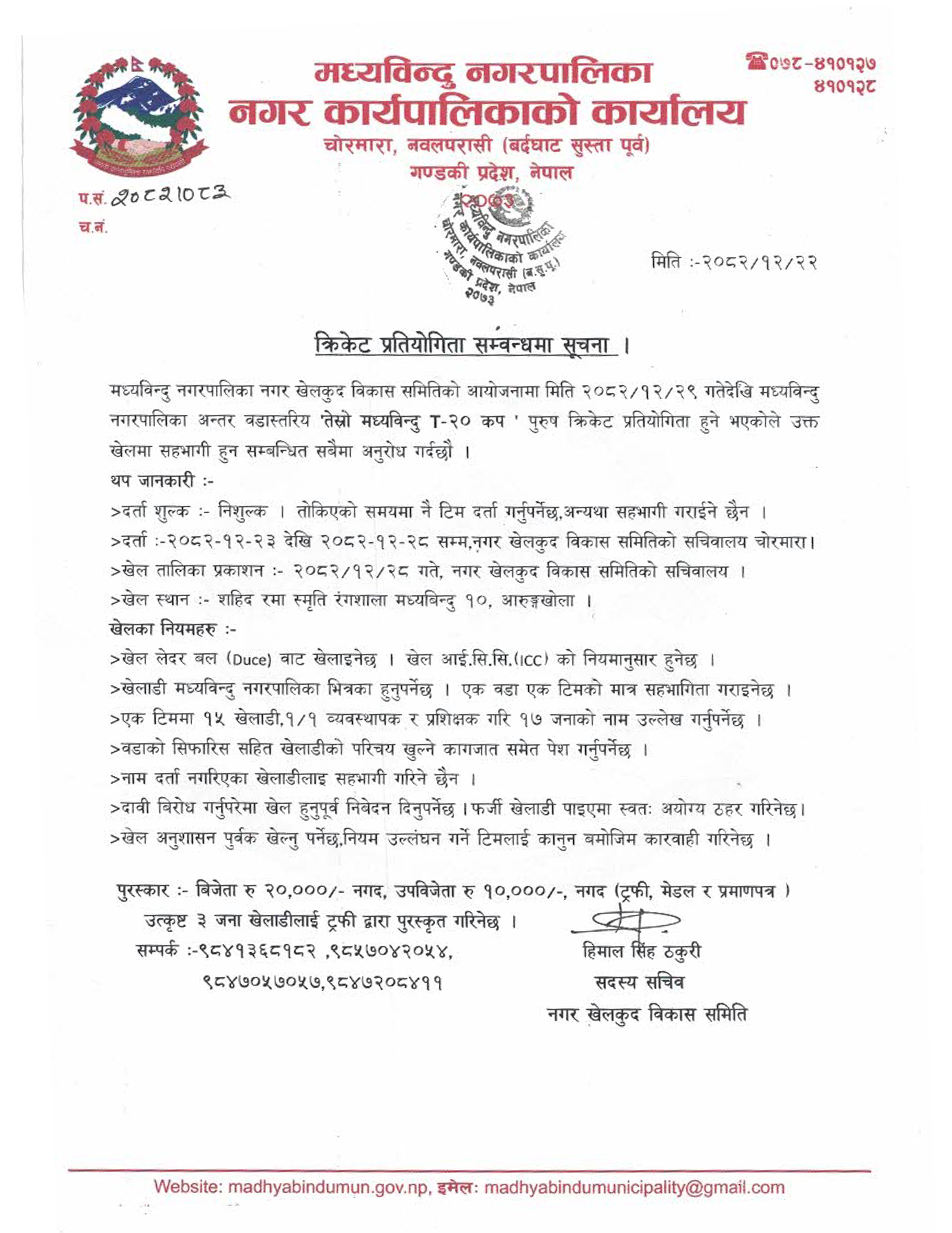 » क्रिकेट प्रतियोगिता सम्वन्धमा सूचना ।