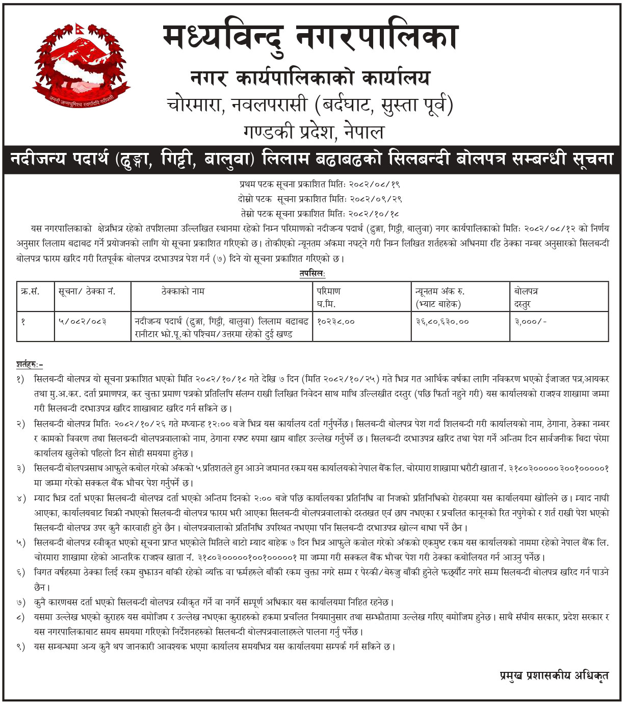 नदीजन्य पदार्थ (ढुङ्गा, गिट्टी, बालुवा) लिलाम बढाबढको सिलबन्दी बोलपत्र सम्बन्धी सूचना