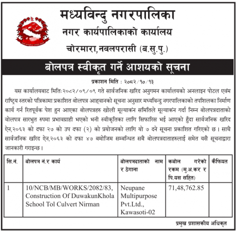 » बोलपत्र स्वीकृत गर्ने आशयको सूचना