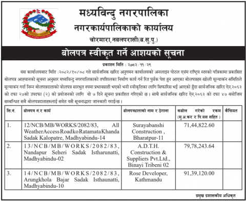 » बोलपत्र स्वीकृत गर्ने आशयको सूचना